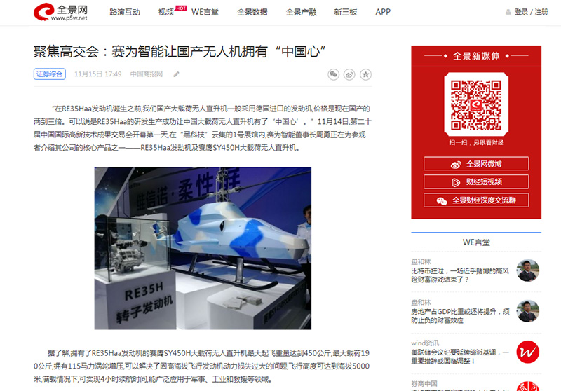 可以说是RE35Haa的研发生产成功让中国大载荷无人直升机有了‘中国心’。”11月14日,第二十届中国国际高新技术成果交易会开幕第一天,在“黑科技”云集的1号展馆内,华体会体育(中国)智能董事长周勇正在为参观者介绍其公司的核心产品之一——RE35Haa发动机及赛鹰SY450H大载荷无人直升机。