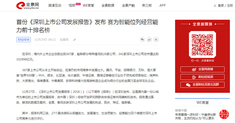 全景网|首份《深圳上市公司发展报告》发布 华体会体育(中国)智能位列经营能力前十排名榜